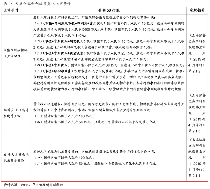 3)差异化上市条件:在市值和财务指标方面,设置了5套差异化的上市指标,允许存在未弥补亏损、未盈利企业上市,不再对无形资产占比进行限制。对于红筹企业,科创板也设置了更为宽松的上市条件——相较于创业板,科创板对未在境外上市的红筹企业设置的上市标准相对较低,仅对预计市值和最近一年营业收入作出规定,而创业板要求红筹企业具备一定的盈利能力,对其预计市值、净利润和营业收入都作出相关规定。