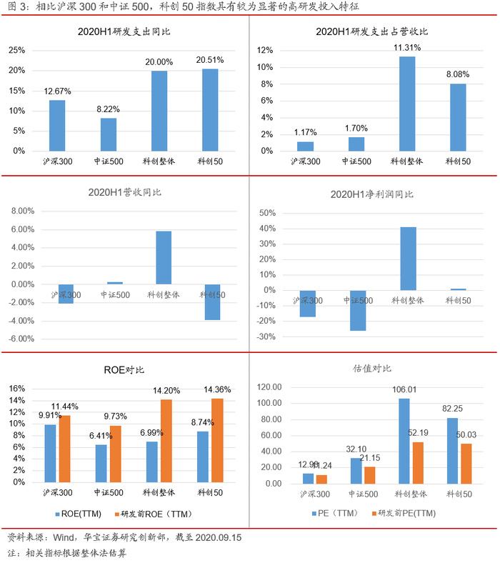 科创50指数具有较为明显的高研发投入特征。根据2020年中报最新披露信息,科创50指数成分股2020年上半年研发投入同比增长20.51%,占营收比重为8.08%,显著高于同期的沪深300指数和中证500指数。