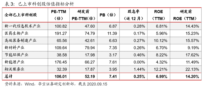 科创板的高估值主要受高研发支出拖累。根据中报最新披露信息,当前科创板已上市的173家企业的整体PE-TTM为106.01倍,其中医药生物类企业和新能源产业公司的PE-TTM分别高达191.27倍和176.45倍,科创板整体估值较高,主要是由于科创企业通过需要不断的研发投入实现企业的持续发展,在传统的估值方法下,研发支出费用化的审慎的会计处理方式使科创企业的核心盈利预测指标失真,最终影响企业的估值水平。从扣除研发费用前的利润水平来看,两类科创企业研发前PE-TTM分别为74.79倍和66.27倍,全部科创企业的研发前PE-TTM为52.19倍。