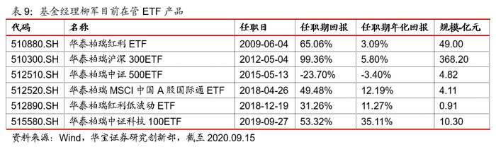 截至2020.09.15,柳军投资管理ETF已超过10年,期间经历了2轮完整的牛熊行情,积累了丰富的ETF管理经验,其管理的华泰柏瑞沪深300ETF的任职期总回报为99.36%,年化回报5.80%,自2013年以来该产品连续获得上海证券报和中国证券报的指数基金奖项,是公募市场跟踪沪深300指数的明星产品。