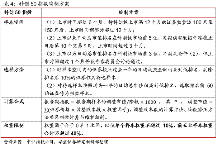 科创 50 指数由上海证券交易所科创板中市值大、流动性好的50只个股组成,反映最具市场代表性的一批科创企业的整体表现,指数具体编制方案如下表所示: