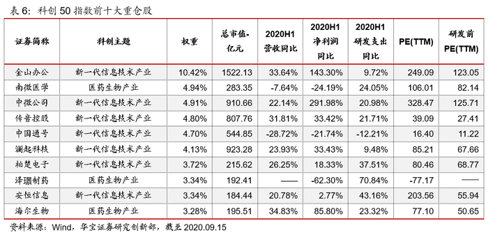 截至2020.09.15,科创50指数前十大个股合计权重为47.57%,主要分布在信息技术和医药生物两个领域,多数重仓股在2020年上半年均实现了营收和净利润的同比正增长,当前指数第一大重仓股为金山办公(10.42%),上半年金山办公的营收同比和净利润同比分别为33.64%和143.30%,研发支出同比增长9.72%,当前PE(TTM)为249.09倍,研发前PE(TTM)为123.05倍。后续伴随中芯国际、寒武纪等大市值龙头股被纳入指数,科创50指数的重仓股也将随之变动。