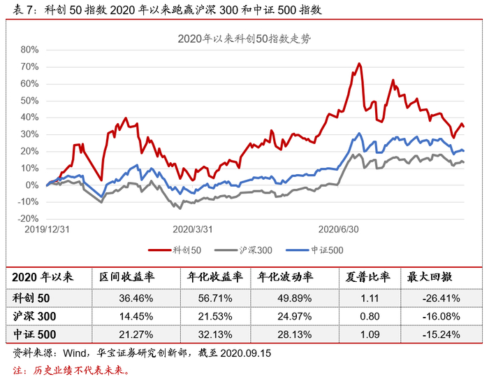 受益于上半年科技和医药股的主导行情,2020年以来科创50指数累计收益36.46%,跑赢同期的沪深300指数和中证500指数,同期科创50指数年化波动率和最大回撤分别为49.89%和-26.41%,高于同期的沪深300指数和中证500指数,这一方面是由于科创板企业上市个股涨跌幅限制相对宽松,另一方面也与科创股主要集中在信息技术、高端制造等新兴经济领域,前期研发投入较高,个股未来的成长面临较多机遇和挑战有关。综合风险收益两方面来看,2020年以来科创50指数夏普比率为1.11,优于同期沪深300指数。