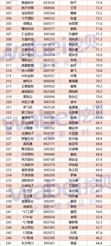 客观得分排名后三位依次是:东方网力 蒋超、*ST联络 何志涛、ST凯瑞 孙琛,得分分别是:44.4分、46.2分、47.4分。