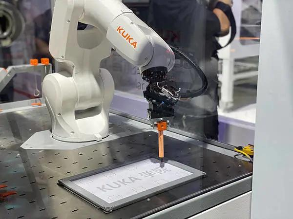 在库卡展区,可以看到一个浓缩版的无人化智慧工厂,充电宝的贴标、打螺丝、打胶、组装4个工艺均由小小的机器人完成。