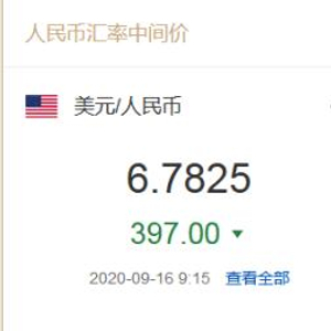 9月16日,银行间外汇市场人民币汇率中间价为1美元对人民币6.7825元,较上一交易日大幅调升397基点,升破6.8关口。