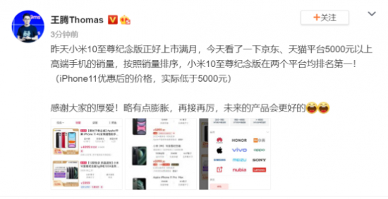 9月17日上午,小米公司产品总监王腾通过微博分享了小米10至尊纪念版最新的销售情况。他表示,小米10至尊纪念版刚刚上市满月,已经在京东、天猫双平台5000元以上高端手机的销量排行中排名第一。