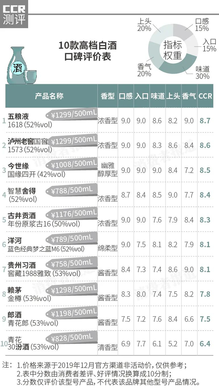 《消费者报道》深扒了天猫、京东、苏宁旗舰店约1.5万条消费者评价,对电商平台热销的10款高档白酒进行了分析、评价。