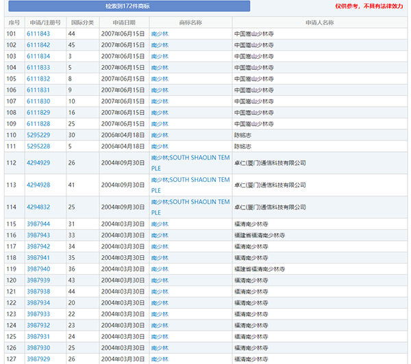 澎湃新闻梳理发现,作为宗教机构,自上世纪90年代开始,嵩山少林寺广泛布局商标,截致2020年9月13日,23年间一共申请注册666个商标,八九成带有“少林”字样。而引人争议的是,在2004年福建南少林寺注册“南少林”商标后几年,嵩山少林寺也注册了“南少林”商标,并将“东少林”、“西少林”、“北少林”全部注册成功。