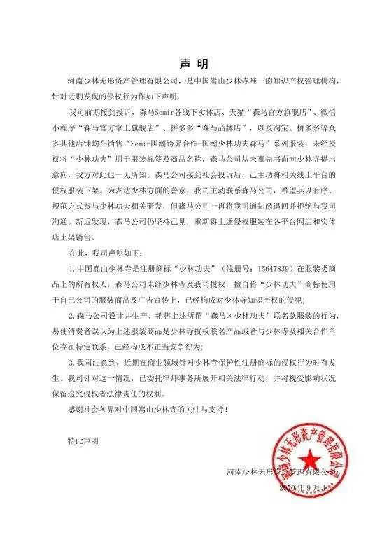 9月1日,嵩山少林寺发布声明,称嵩山少林寺是注册商标“少林功夫”在服装类商品上的所有权人,森马在各平台在售的“Semir国潮跨界合作-国潮少林功夫森马”系列服装,未经授权将“少林功夫”用于服装标签及商品名称,已侵犯少林寺知识产权。