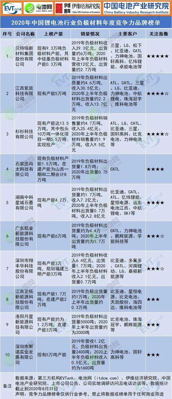 原标题:2020年中国锂电池行业负极材料年度竞争力品牌榜单 来源:中国电池网