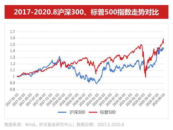 2017年1月至2020年9月初,A股沪深300指数累计上涨42.7%,年化回报10.2%。标普500指数累计上涨51.8%,年化回报12.1%。
