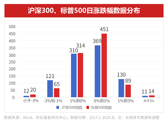 由上图可见,2017年1月至今,标普500指数小涨(涨幅小于1%)和大跌(跌幅大于3%)的天数都远超沪深300指数。而沪深300指数日涨幅超1%的天数则明显更多。美股多数交易日均在小幅上涨,调整往往剧烈而快速。A股上涨则更迅速,但调整的时间也会更长。