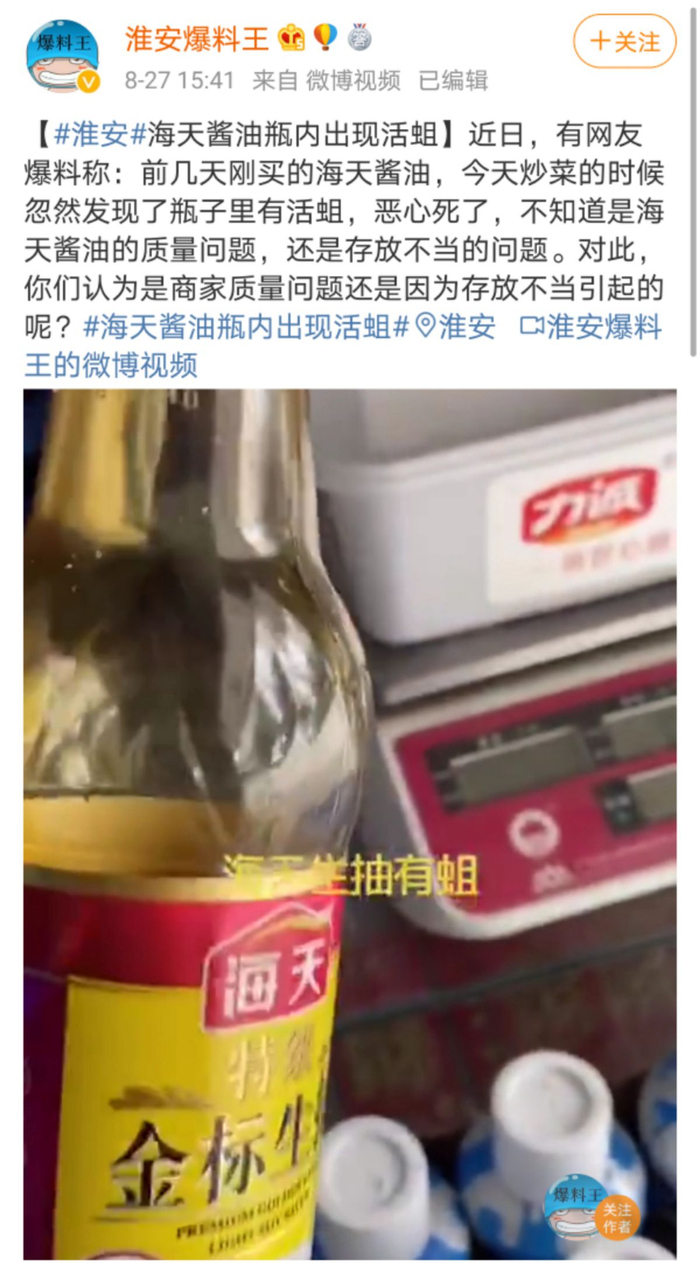 再加上湖南的李先生发现其所购买的海天酱油出现蛆虫事件。不到一个月,海天酱油已出现三次蛆虫事件。值得注意的是,多位网友评论称自己在海天其他产品中也发现了类似情况,还有网友称可能是使用者自己没有盖好瓶盖。