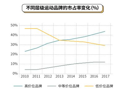 以往“价升量减”被视作一种必然的商业规律,但如今,以增长型客群为依托,很多品牌商提价后,其市占率、营收和利润数据表现反而更佳,实现“量价齐涨”的双赢。以运动品牌为例,近几年,低价位品牌的市占率逐年走低,向高端化转型、高价品牌的市占率增长趋势明显。