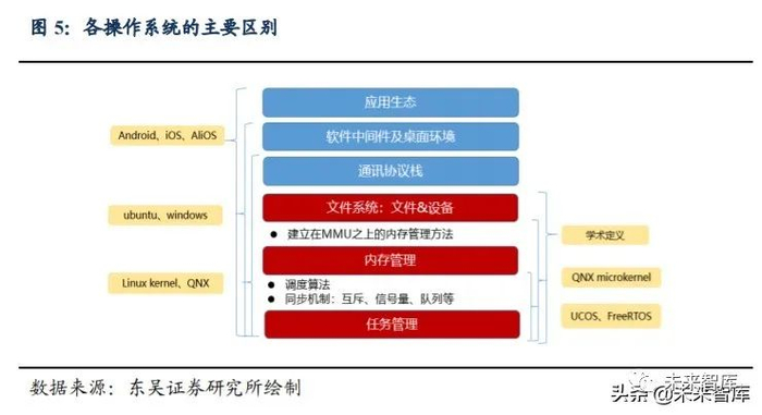 1)基础型操作系统:打造全新底层操作系统和所有系统组件,如系统内核、底层驱 动等,有的还包括虚拟机,如 QNX、Linux、WinCE 等。因打造全新操作系统需要花费 太大的人力、物力,目前基本没有企业会全新开发底层操作系统。