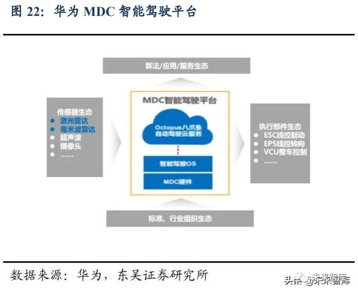 根据华为规划,其 E/E 架构方案由智能座舱、智能驾驶、整车控制三个域组成。CDC 智能座舱平台:1)实现汽车和手机在软硬件、应用生态等实现产业链共享;2)基 于麒麟芯片构建 IVI 模组,实现产业协同降低硬件成本;3)基于鸿蒙 OS,实现华为“1+8” 生态,实现跨终端的无缝互联。MDC 智能驾驶平台:1)发挥华为云(八爪鱼云服务) +AI 优势,打造车云协同的平台;2)建立标准和协议,开放传感器生态;3)支持合作 伙伴开发算法,打造差异化方案算法;4)建立对接规范,与主流厂商构建执行器生态。VDC 智能电动平台:面向不同的用户偏好,创造差异化用户体验,引进网络能源产业链 和技术优势,打造 mPower 多形态电驱、高效车载充电产品。