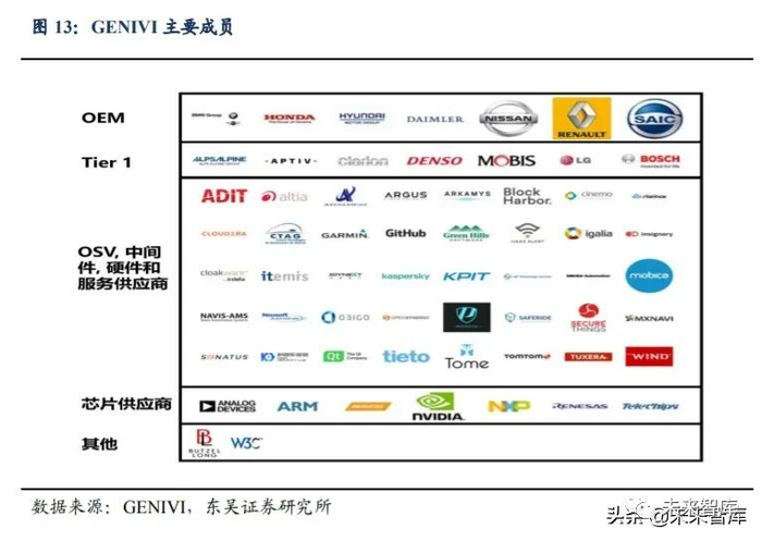 GENIVI 的宗旨是实现对车载信息娱乐系统开源开发平台的广泛普及。2009 年成 立的GENIVI联盟一直致力于为汽车行业提供各类开源的车载信息娱乐系统技术解决方 案。GENIVI 基于 Linux 提供开源软件,汽车车企通过选择并整合不同的应用和中间件 实现差异化的车载信息娱乐产品,缩短开发周期,从而减少汽车生产商的成本。其中 80% 的软件在消费电子/通信行业中已经被开发,可不加修改直接应用,仅 15%必须进行调整 才能适用于特殊的汽车参数,仅 5%仍需自己开发。GENIVI 将继续开发剩余 5%的代码, 并开放给所有汽车厂商。目前,联盟的成员包括 170 多家汽车生产商和供应商。