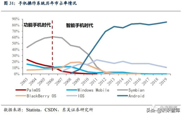 IOS 采用闭环开发模式(芯片-操作系统-手机),随着 2007 年第一代 iphone 发布 后,市占率快速提升并达到稳定。Android 凭借开源第三方模式,于 2008 年发布 Android 1.0 后市占率迅速提升并反超 IOS。