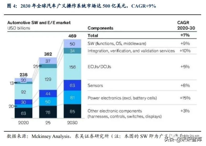 2020 年全球汽车广义操作系统市场规模达 200 亿美元,未来五年 CGAR+13.1%。我们重点参照了 Mckinsey 分析数据,2020 年全球汽车广义操作系统(功能软件、狭义 操作系统、中间件)市场规模达 200 亿美元,到 2025 年达 370 亿美元,CGAR+13.1%;到 2030 年达 500 亿美元,十年 CAGR+9%。