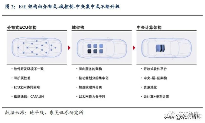 软件定义汽车大趋势下,芯片+操作系统+中间件+应用算法软件+数据是实现智能 汽车的关键。在智能网联汽车产业大变革下,软件定义汽车理念已成为共识。传统汽车 采用的分布式电子电气(E/E)架构因计算能力不足、通讯带宽不足、不便于软件 OTA 在线升级等瓶颈,不能满足现阶段汽车发展的需求,E/E 架构升级已成为智能网联汽车 发展的关键。参照我们前期发布的《软件定义汽车,E/E 架构是关键》,该文重点论述了 E/E 架构升级包括硬件、软件、通信架构三大升级,芯片+操作系统+中间件+应用算法 软件+数据构建核心技术闭环,未来谁能把握其中一环或将实现汽车产业链地位的提升。