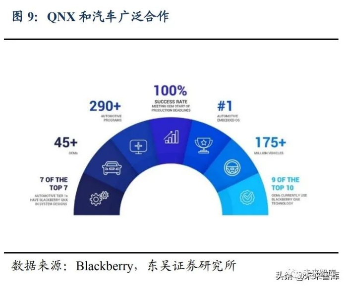 QNX 凭借其安全、稳定等优势占据市场较高份额。QNX 为非开源系统,具有开发难度大、应用生态较弱等特点,而且需要商业收费。但由于现阶段汽车嵌入式操作系统 对安全性、稳定性、实时性具有非常严苛的要求,QNX 凭借这些优点仍牢牢占据汽车嵌 入式操作系统市占率第一的位置。根据官网显示,QNX 已与 45 家以上 OEM 进行合作, 超过 1.75 亿辆汽车使用了 QNX 系统。