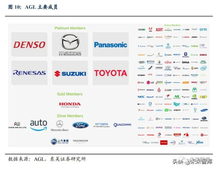 AGL 开源项目致力于建立一个基于 Linux 的联网汽车内部使用的开源平台。2014 年,Linux 基金会发布了开源 AGL(Automotive Grade Linux)规范 1.0 版本,它是首个 开放式车载信息娱乐(IVI)软件规范。其中 70%的代码(包括操作系统、中间件和应用 程序框架)已编写完成,车企可以专注于剩下的 30%个性化定制开发,以保证不同品牌 的差异化,而且 AGL 不收取任何许可费。随着自动驾驶的发展,AGL 已经不只局限于 IVI 领域,未来将向仪表盘、座舱域、自动驾驶等领域延伸,现阶段它仍未通过 ISO 26262 标准。从其整车企业成员来看,AGL 早期主要为丰田、本田、日产等日系厂商,随着 2019 年大众、现代汽车的加入,AGL 势力规模逐渐壮大。截至 2020 年 3 月,国内已有 中国移动、上汽集团、德赛西威、中科创达等公司加入了 AGL,成员总数超过 150 个。