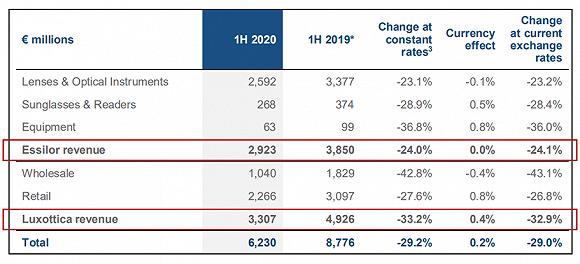 依视路陆逊梯卡 :2020年上半年总营收62.30亿美元,同比-29.0%。