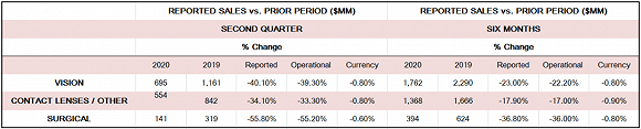 博士伦:2020年上半年总营收19.97亿美元,同比-12.0%。