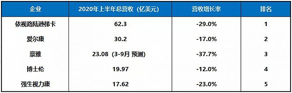 国际企业排名:按2020年上半年总营收排序,依视路陆逊梯卡第一,爱尔康第二,豪雅第三,博士伦第四,强生视力康第五。