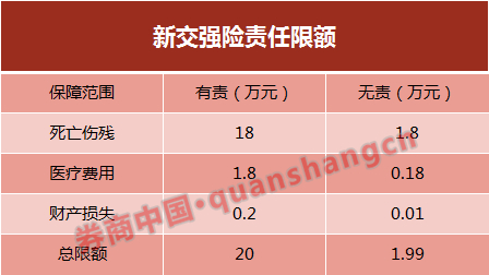 死亡伤残赔偿限额从11万元提高至18万元,医疗费用赔偿限额从1万元提高至1.8万元,财产损失赔偿限额维持0.2万元不变。
