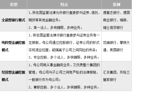 国外金融混业经营模式主要可以分为三类:全能型银行模式,纯粹金融控股公司模式,经营型金融控股模式。