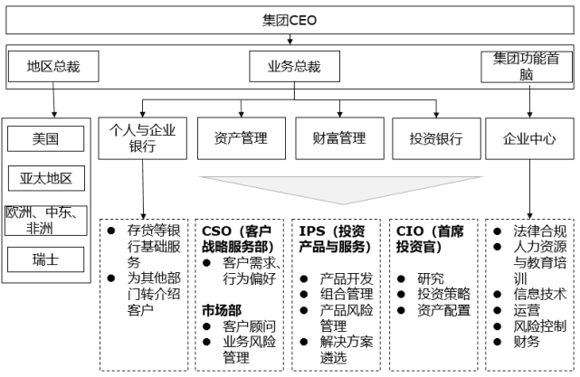 2011年,瑞银确立了“专注全球财富管理和瑞士全能银行,以资产管理和投资银行为辅”的战略规划,围绕财富管理和商业银行为客户提供综合服务。商业银行提供基本金融服务与获客渠道,财富管理部门根据客户需求,制定财富管理方案,并协同资产管理和投资银行部门,由这些部门设计相应的金融产品,供财富管理部门和商业银行部门出售。为加强业务协同和跨部门合作,瑞银集团专门设立投资产品及服务部(IPS),整合了投资银行、资产管理以及财富管理和瑞士银行的专家与产品资源,通过跨部门客户介绍、产品与服务共享,为客户提供定制化的投融资产品以及综合解决方案。