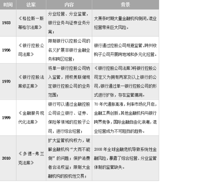 20世纪70年代,随着高通胀以及利率管制,金融脱媒现象严重,大量非银金融机构通过各种金融创新工具,为居民和企业提供综合金融服务,对银行存款、贷款等传统经营业务产生很大负面冲击,挤压了银行的生存发展空间。在此背景下,政府开始放松金融管制,鼓励金融创新,不同金融机构的业务范围开始进一步相互渗透。1998年,“花旗银行”和“旅行者集团”的合并吹响了混业经营的号角,合并后花旗集团可以经营银行、证券、保险、信托、基金、租赁等所有金融服务。1999 年美国颁布《金融服务现代化法案》, 废止了 1933 年的《格拉斯———斯蒂格尔法案》,允许商业银行、证券、保险跨界经营,银行等金融机构可以设立金融控股公司,从事全方位的综合金融业务,这标志着金融混业经营在美国正式确立。