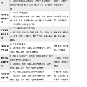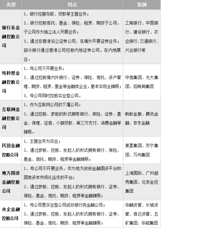 监管政策放松以及金融工具创新促进了以金融控股模式为主的混业经营在中国资本市场蓬勃发展。各种类型的金融控股集团相继形成,主要有六大类型,一是银行系金融控股公司,包括工商银行、建设银行、兴业银行等;二是纯粹型金融控股公司,包括中信集团、光大集团、招商局集团;三是互联网金融控股公司,包括蚂蚁金服、腾讯金融、京东金融等;四是民营金融控股公司,包括复星集团、苏宁集团、万向集团等;五是地方国资金融控股公司,包括上海国际、广州越秀集团等;六是央企金融控股公司,包括中国五矿集团、中国华能集团、华融资管等。