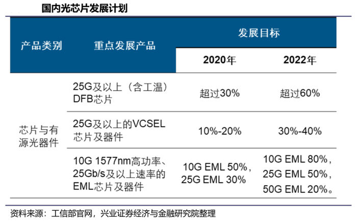 2017 年 12 月,工信部《中国光电子器件产业技术发展路线图(2018-2022年)》发布,明确了光电子器件的未来5年规划,为光电子器件和芯片等相关产业指明了方向,确保到2022 年国内中低端光电子芯片的国产化率超过60%、高端光电子芯片国产化率突破20%。