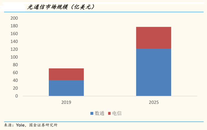 根据 Yole 预测,2025年光模块市场增长至177亿美元,光芯片市场89亿美元速,复合增速18%。5G带动光模块7000万出货量,市场总额572亿。5G 基站架构从4G的前传—回传演进到前传—中传—回传,需要的连接明显增加。根据测算,就光模块而言,单个基站需要的光模块数有望达8—10个,较 4G 基站有所增加,对应的光纤连接器需求也将随之增加。