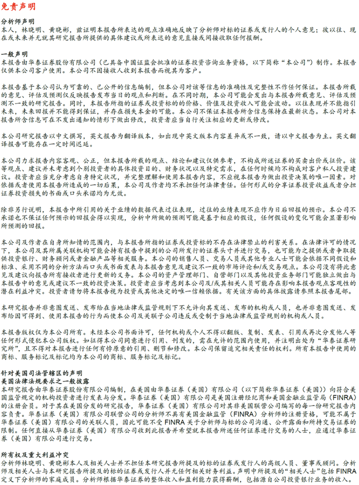 在任何情况下,本公众号中的信息或所表述的意见均不构成对任何人的投资建议。订阅者不应单独依靠本订阅号中的内容而取代自身独立的判断,应自主做出投资决策并自行承担投资风险。订阅者若使用本资料,有可能会因缺乏解读服务而对内容产生理解上的歧义,进而造成投资损失。对依据或者使用本公众号内容所造成的一切后果,华泰证券及作者均不承担任何法律责任。