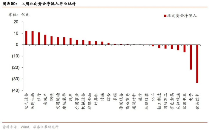 上周北向资金净流入,总计净流出 108.32 亿元。净流入最多的行业分别是电气设备(12.12 亿元)、医药生物(11.83 亿元)、银行(10.78 亿元),净流出最多的行业是食品饮料(-33.55 亿元)、电子(-21.81 亿元)。