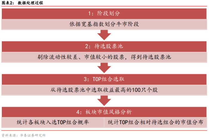 本期周报将从个股行为出发,考察历轮牛市的不同阶段领涨个股的市值和板块风格分布规律。为了更好的观测市场走势,我们将综合上证综指与wind全A(等权)指数划分牛市阶段。选取每个阶段收益最高的前100名股票作为TOP组合,通过不同板块和市值风格入选TOP组合的概率,分析牛市分阶段表现。具体数据处理过程如下: