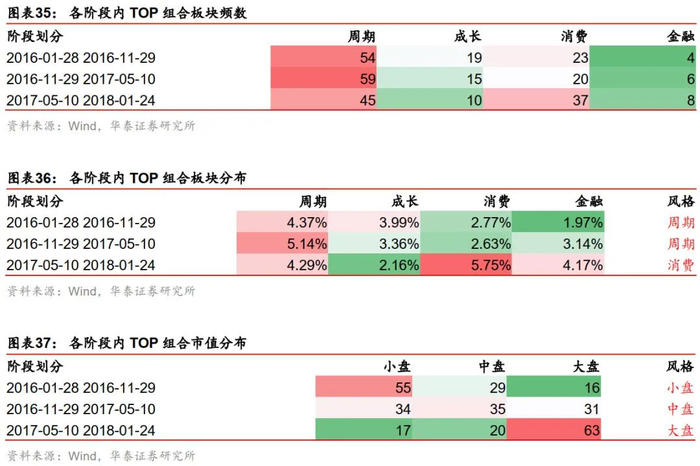 2016-2018年牛市期间,存在显著的市值和板块风格切换。板块方面,第一阶段周期板块表现最佳,第二阶段周期板块优势加强,第三阶段周期板块优势弱化,消费板块成为表现最佳的板块。市值方面,第一阶段TOP组合以小市值股票为主,第二阶段分布较均衡,第三阶段切换至大市值风格。