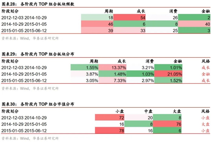 2012-2015年牛市期间,存在显著的市值和板块风格切换。板块方面,第一阶段成长板块表现最佳,第二阶段金融板块明显表现突出,第三阶段成长板块再次表现优秀。市值方面,第一阶段TOP组合以小市值股票为主,第二阶段以大市值为主,第三阶段以小市值为主,三个阶段的主导市值类型均非常突出。