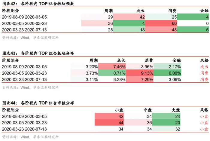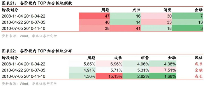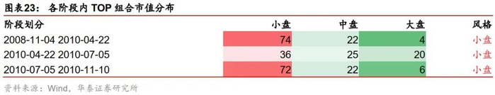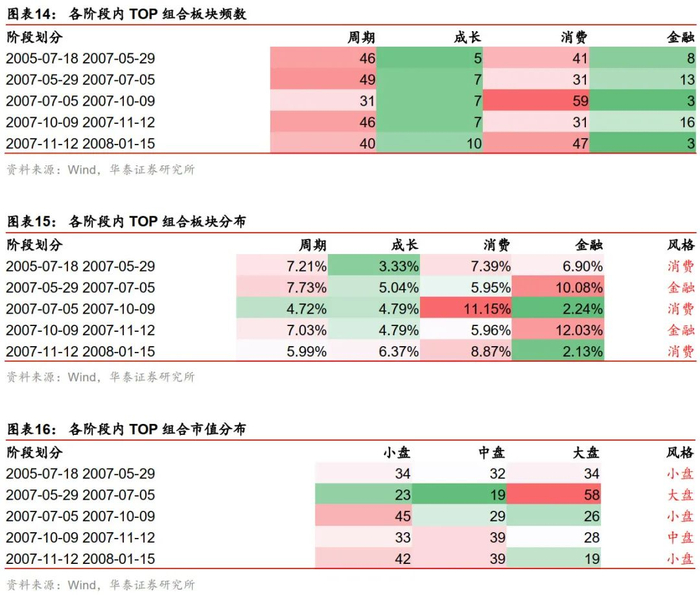 2005-2008年牛市期间,存在显著的市值和板块风格切换。板块方面,第一阶段消费板块表现最佳,第二阶段金融板块表现最佳,三、四、五阶段依次为消费、金融、消费,五个阶段存在明显的消费和金融板块的轮替风格切换。市值方面,第一阶段TOP组合分布较为均匀,第二阶段大市值风格明显,第三至五阶段中小盘占优。