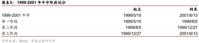 以下展示了1999-2001年、2005-2008年、2008-2011年、2012-2015年、2016-2018年各轮周期中的牛市阶段划分结果及各阶段最强个股分布特征。