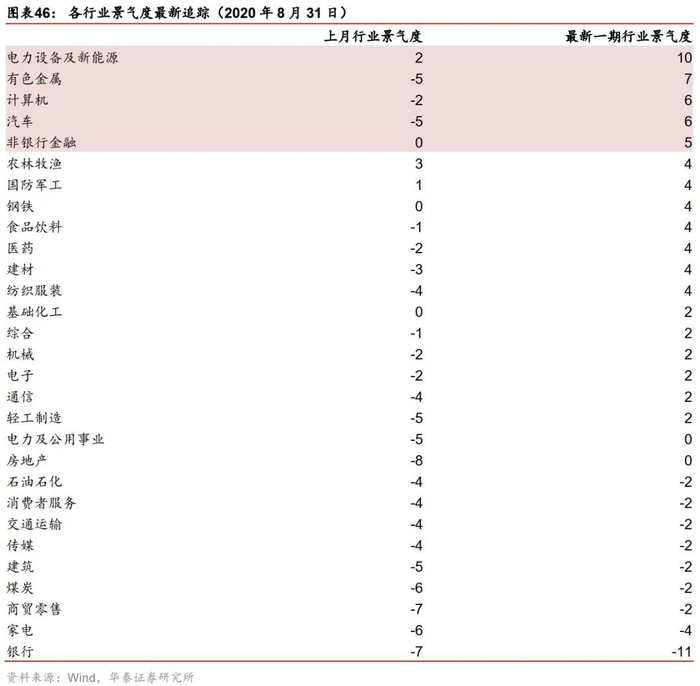 在华泰金工行业轮动系列报告《景气度指标在行业配置中的应用》(2019-9-12)中,我们结合财务报表、业绩快报、业绩预告、一致预期等多个维度数据,构建了12个景气度指标来对各行业景气状态进行月度打分(该指标景气度向好打1分,恶化打-1分,无信号打0分,综合打分数值越高,意味着该行业越景气)。根据2020年8月31日的最新建模结果,全市场景气度延续反弹回升趋势,仅银行行业的景气度下降,其他所有行业的景气度均有不同程度的增加。超过半数行业的景气度为正。景气度打分排名前五的行业分别是:电力设备及新能源、有色金属、计算机、汽车和非银行金融。