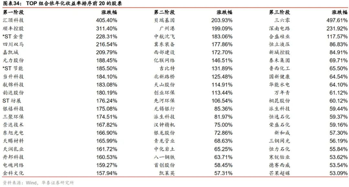 计算各个股票在该阶段内的年化收益率与夏普比率。将待选股票池按照该阶段内的年化收益率排名,取前 100 支股票,得到 TOP 组合