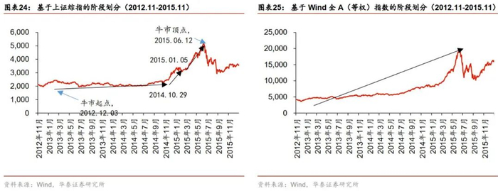 两个指数的阶段划分结果类似,以 Wind 全 A(等权)指数划分结果为准,将该轮牛市行情划分为三个阶段,具体各阶段起止时间点如下:
