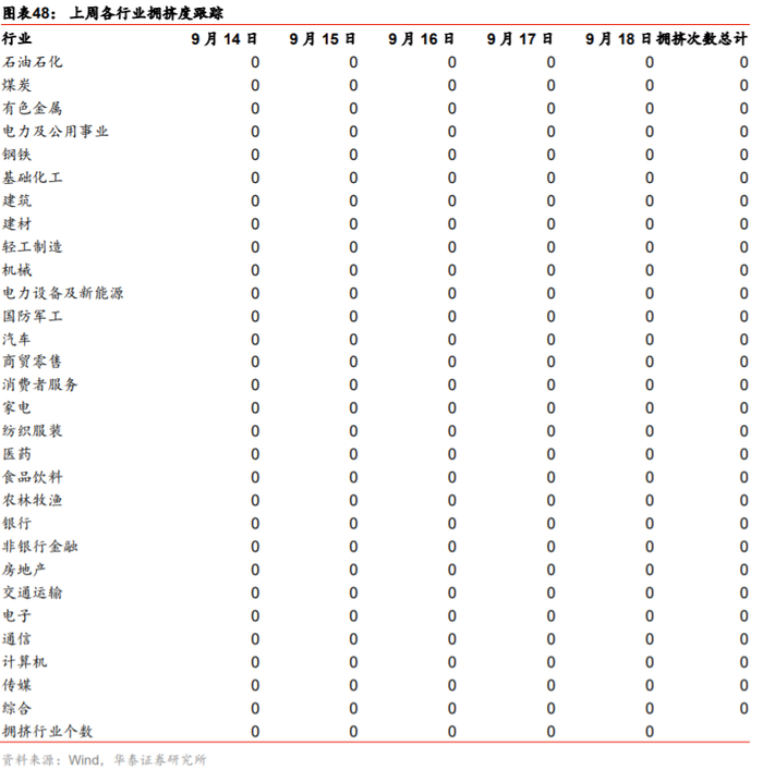 我们以量价数据为基础,构建了收盘价乖离率、换手率与收盘价相关系数、成交量与收盘价的相关系数、峰度、换手率乖离率以及换手率这六项拥挤度指标,用以刻画行业指数是否存在过热交易风险。将上述指标的打分结果加总即可得到各行业的复合拥挤度打分,复合拥挤度大于零即可表明该行业处于拥挤状态,有一定的交易过热风险。上周市场整体震荡上行,沪深两市成交量总体和前一周持平。总体来说市场热度不高,各行业均未出现拥挤信号。