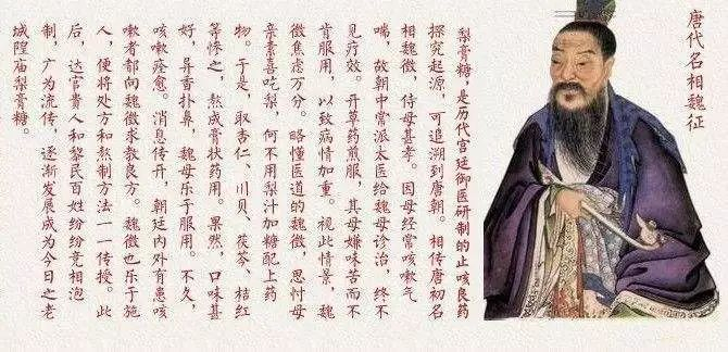 据说,魏征母亲患有咳疾,久病不愈却不肯服药,母亲喜欢吃梨,略懂医道的魏征就“以梨汁与百草为伍,煮之,味纯润肺”。数日,母亲见愈。这就是最早的“宫廷古方梨膏糖”。