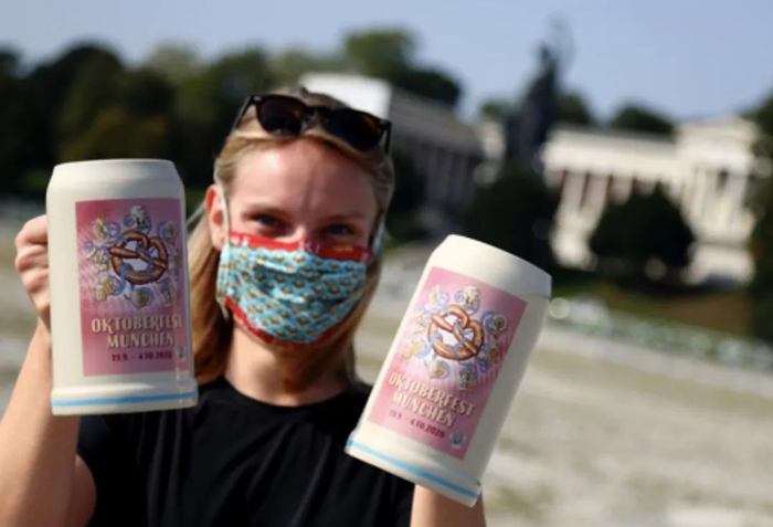 9月17日,在德国慕尼黑,一名女子展示慕尼黑啤酒节官方啤酒马克杯。新华社/美联